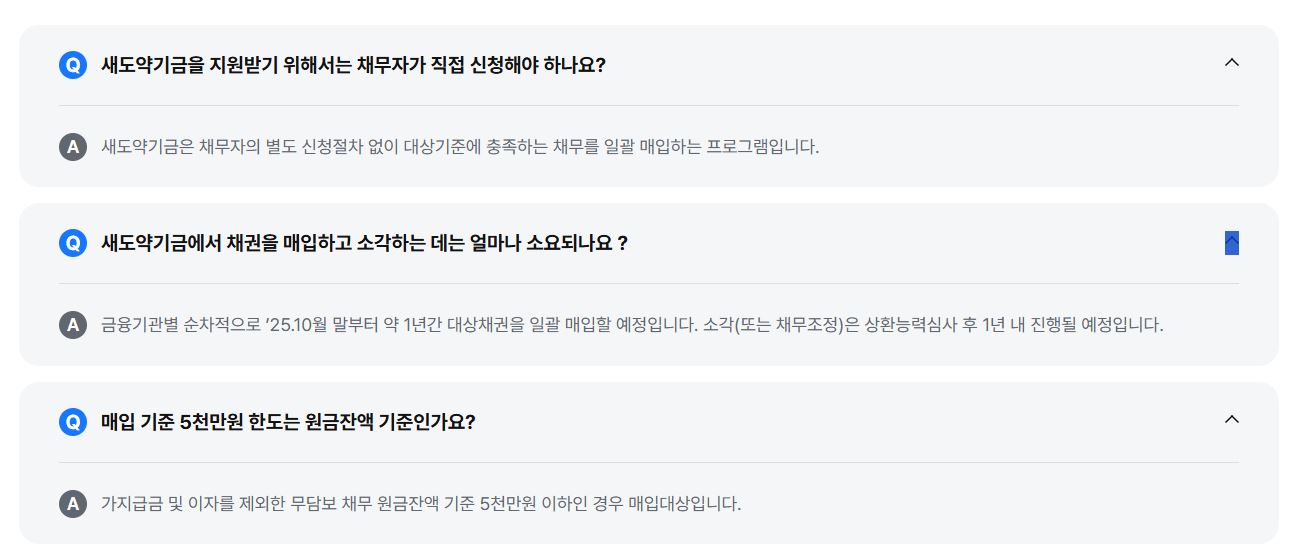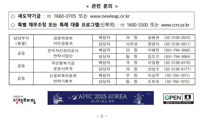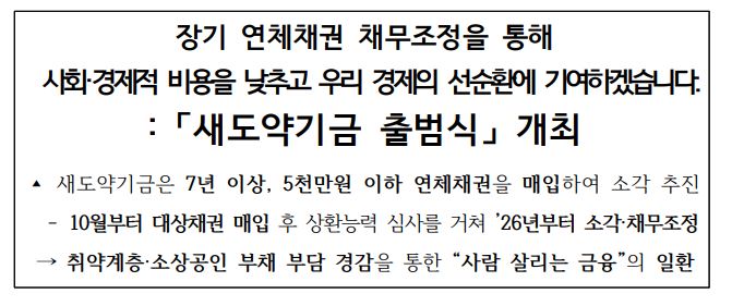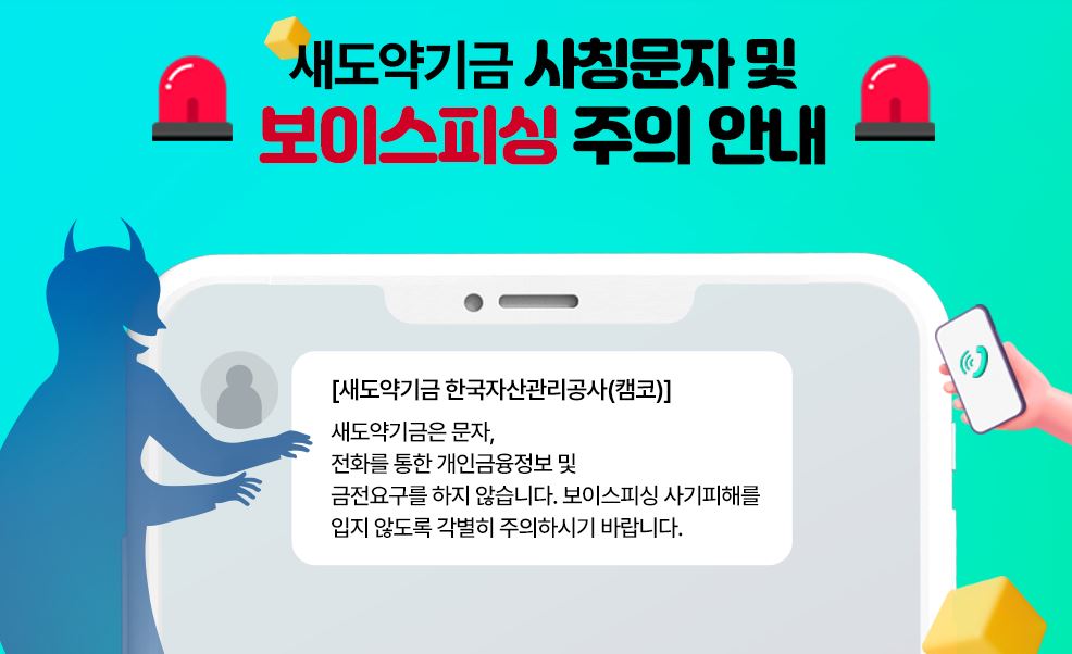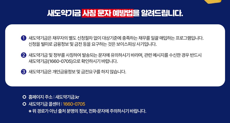 - 사기 주의: 최근 정부 지원을 빙자한 보이스피싱이 기승을 부립니다. 새도약기금은 절대로 먼저 문자를 보내 앱 설치를 유도하거나 수수료를 요구하지 않습니다.