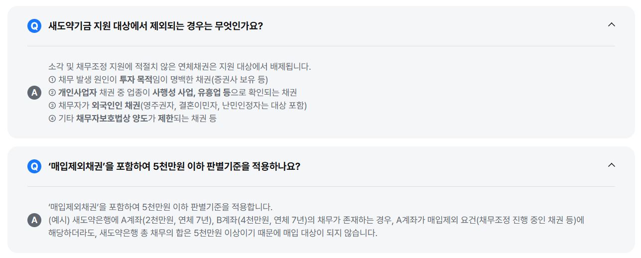 금융기관에 빌린 돈(원금)이 5천만 원을 넘어가면 해당 채무는 새도약기금의 '소액 장기연체자 지원' 트랙에는 포함되지 않을 수 있습니다.
